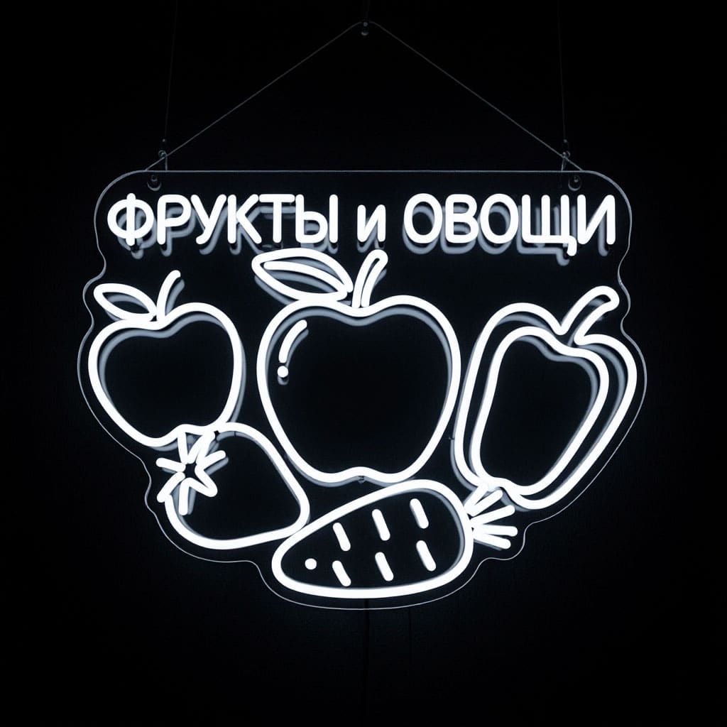 Неоновая вывеска «Фрукты и овощи» — это не просто источник света, а мощный маркетинговый инструмент и стильный элемент дизайна. Она подчеркнёт концепцию вашего заведения, привлечёт новых гостей и создаст запоминающийся образ.